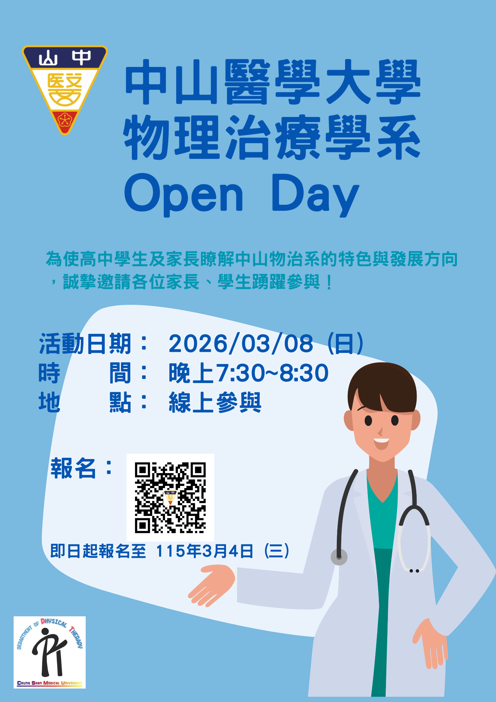 【招生】115.03.08(日)中山物治系Open Day活動,歡迎高中家長、高中生參加